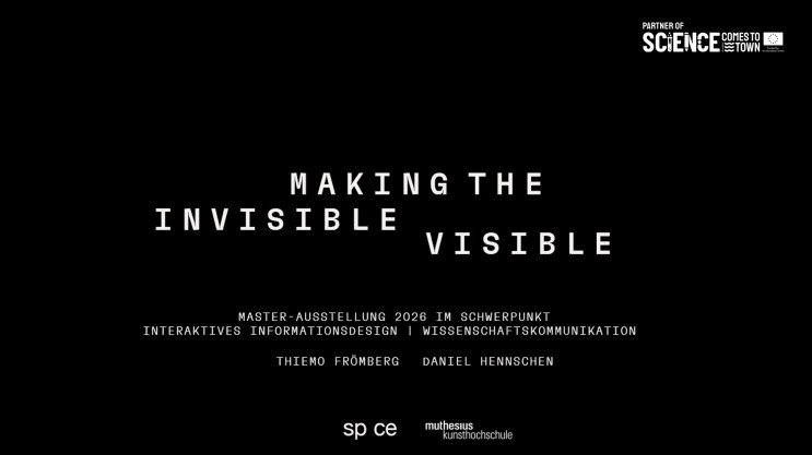 The exhibition at the sp ce of the Muthesius Academy of Fine Arts and Design presents the master's thesis projects of Thiemo Frömberg and Daniel Hennschen. They exemplify what the "Interactive Information Design" major stands for: making the invisible visible, tangible and narratable. Through interactive, media-based exhibits, complex research processes and abstract data are translated into sensory forms that combine perception and understanding. This results in visualisations that not only inform, but also open up their own visual worlds as creative settings and continue to resonate in the visitors' experience. The content and factual accuracy of the research presented remains the top priority; it forms the basis for responsible reduction, staging and artistic interpretation.